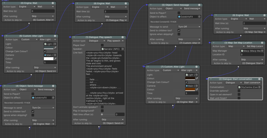 The next step is to implement the dialogue and the majority of the logic through an actionlist. Actionlists are the visual scripting tool for a Unity asset called Adventure Creator, which is really great for making adventure games like this. Basically, this actionlist is applying the correct visual effects, playing the dialog lines, and then turning off the visual effects after the dialog is over.