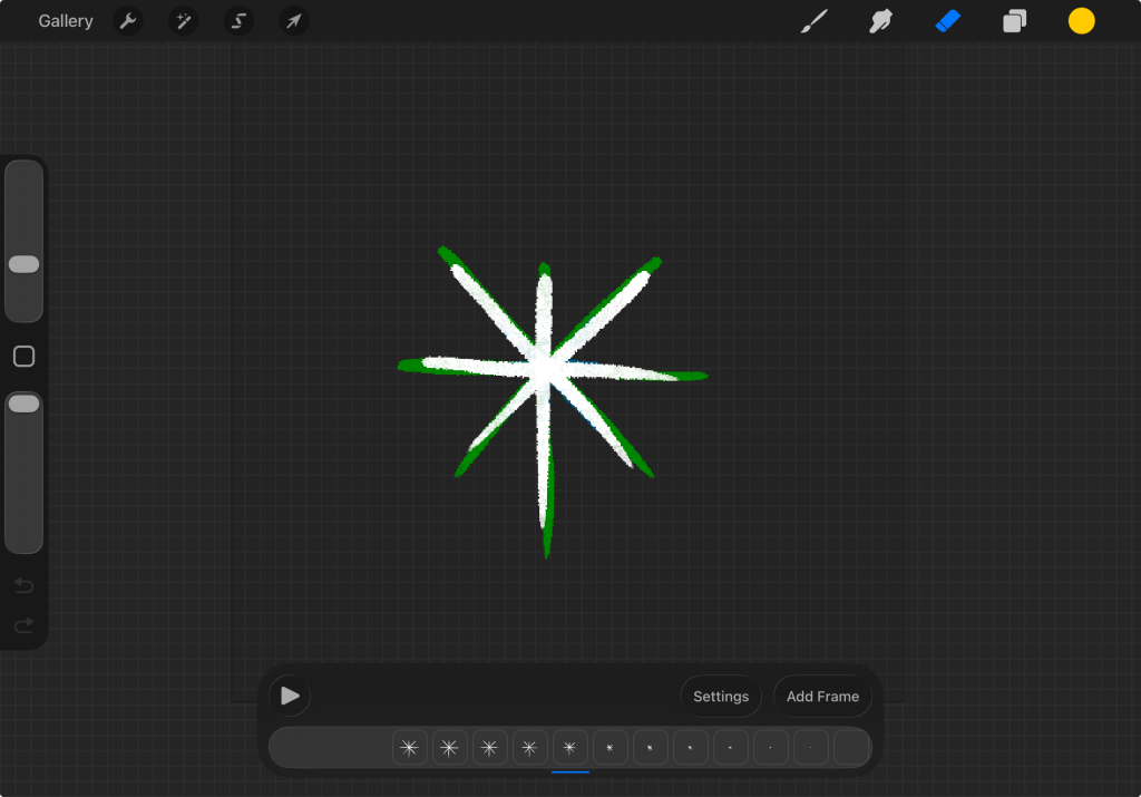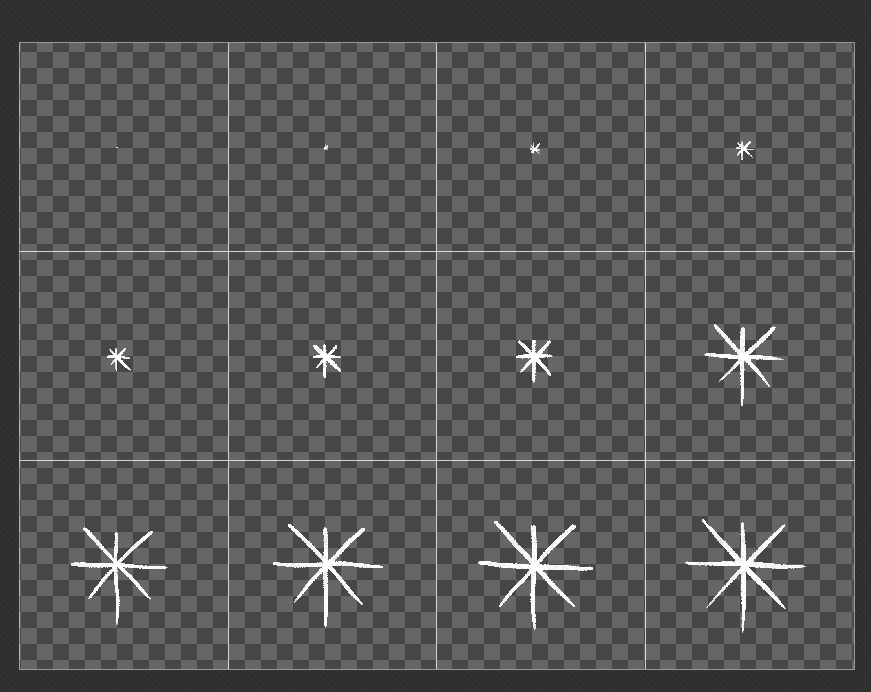 For the snowflake particles I first started by making the animtions in Procreate, a drawing app for iPad. For simple animations like these, I start with the full drawing, and then just do straight ahead animation to make it smaller, then tweak the animation to get the timing I want. I then exported each frame to my computer, and bundled them together as a sprite sheet for each snowflake. In Unity, I can take this sprite sheet and use it as an animated texture for particles, and then I can tweak how I want them to appear and move.