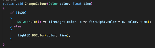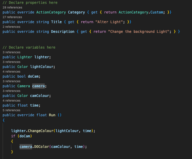 The basic way this particular action works is it takes in the light I want to change the colour of, the new colour, and how long I want the transition to take. It also has the option to change the camera background colour, which is necessary because the background texture has transparency, which is how the game gets that parchment background look. The action takes those values in, and when it’s run it tweens the light and background colour to match the new colours I have in mind.